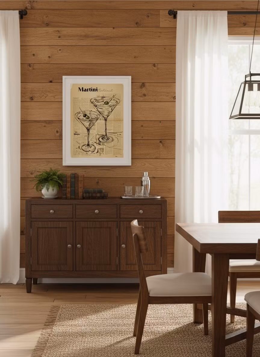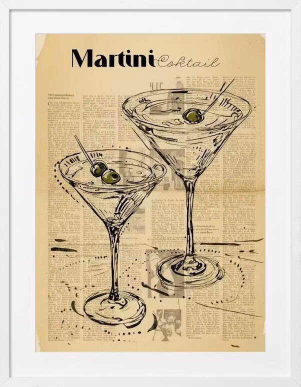 Två klassiska Martiniglas skissade mot en bakgrund av vintage tidningsartiklar. En tidlös och sofistikerad poster som perfekt fångar den vuxna atmosfären av en